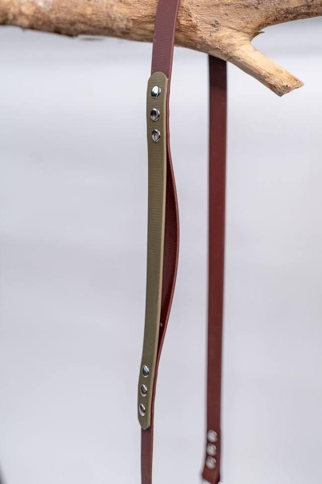 Dans notre exemple en photos, la poignée principale et secondaire sont en Military Olive et la longe en Saddle Marron.